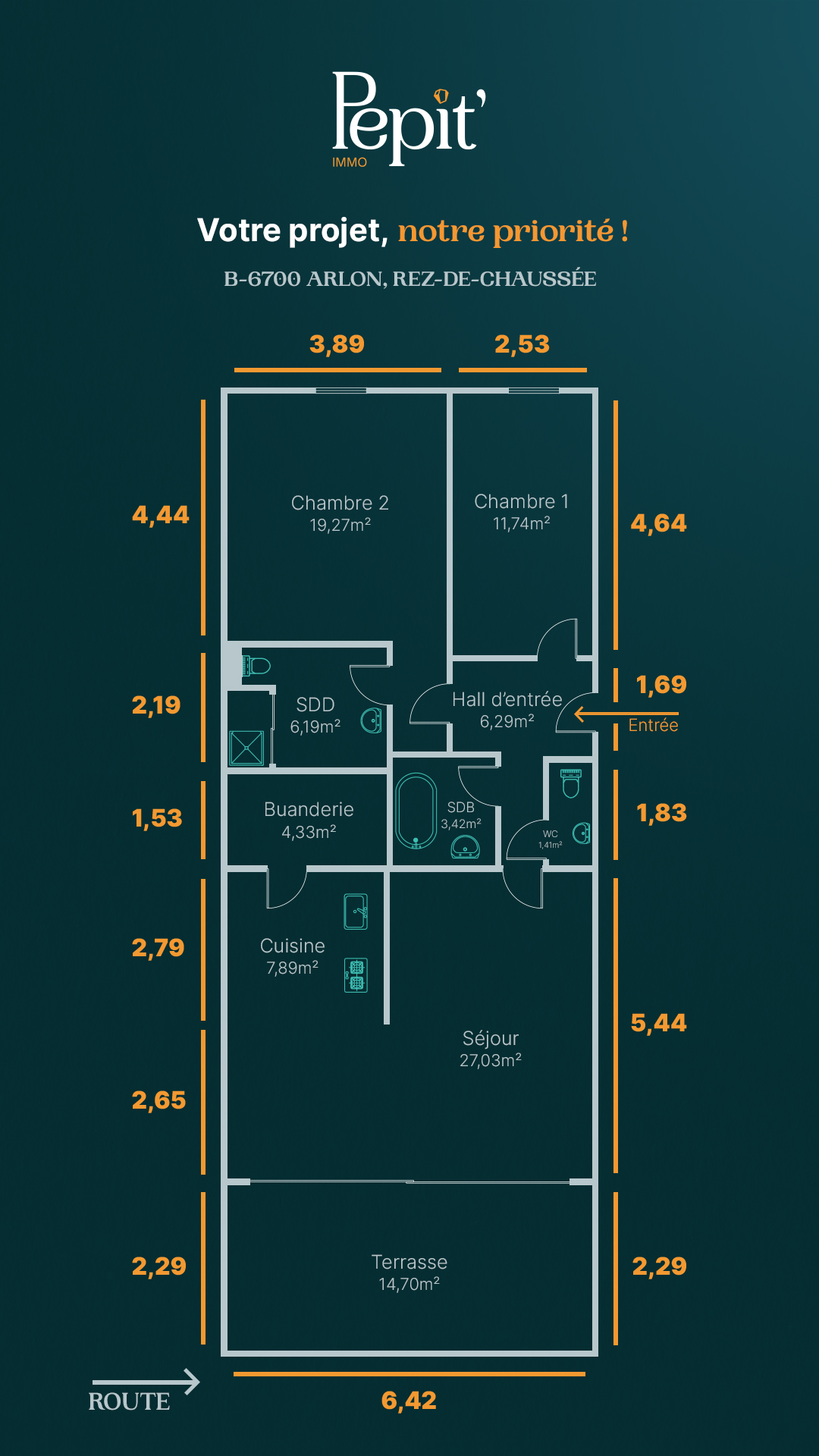- Hall d'entrée:27.03 m2